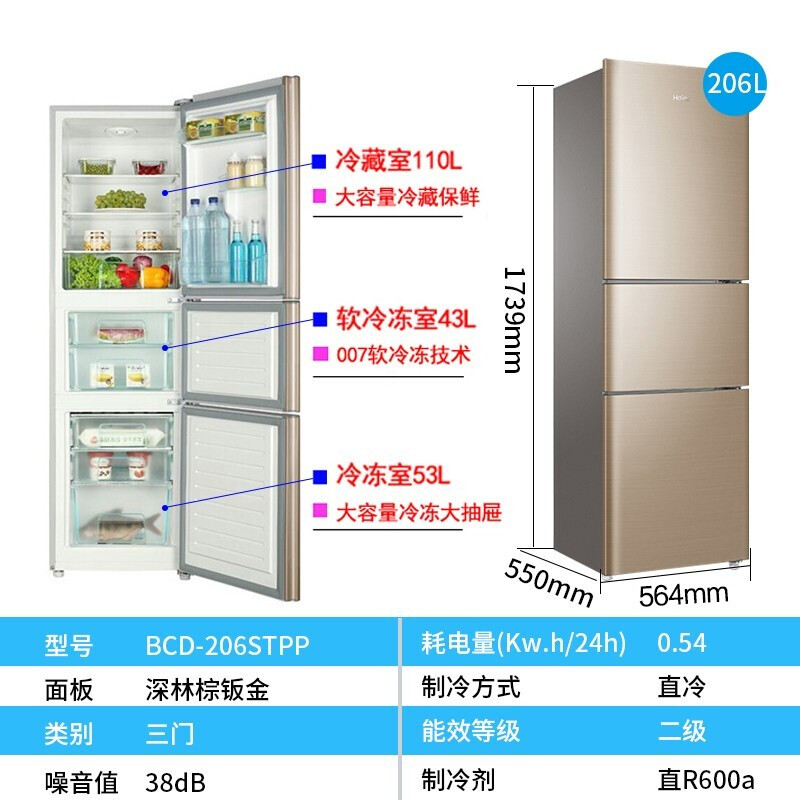 海尔(Haier) 206升直冷三门冷藏冷冻节能静音冰箱 B...
