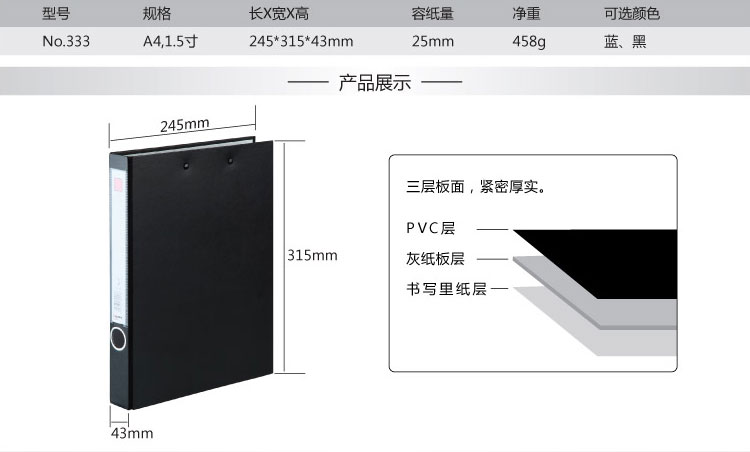 齐心(COMIX) NO.333-X(蓝)A4纸板文件夹(长...