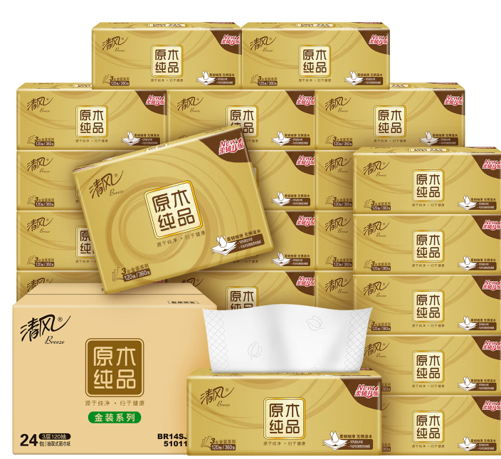 清风 原木金装抽纸巾3层120抽24包柔韧整箱装