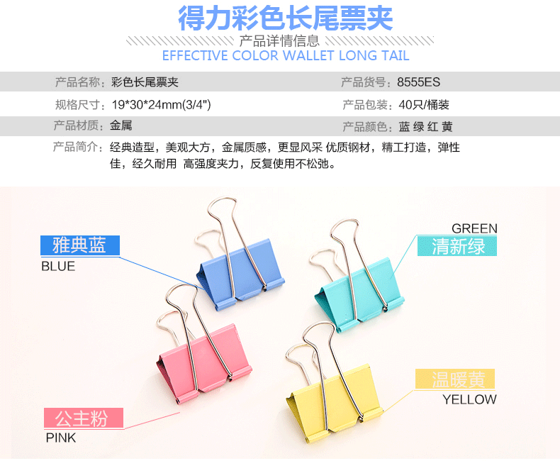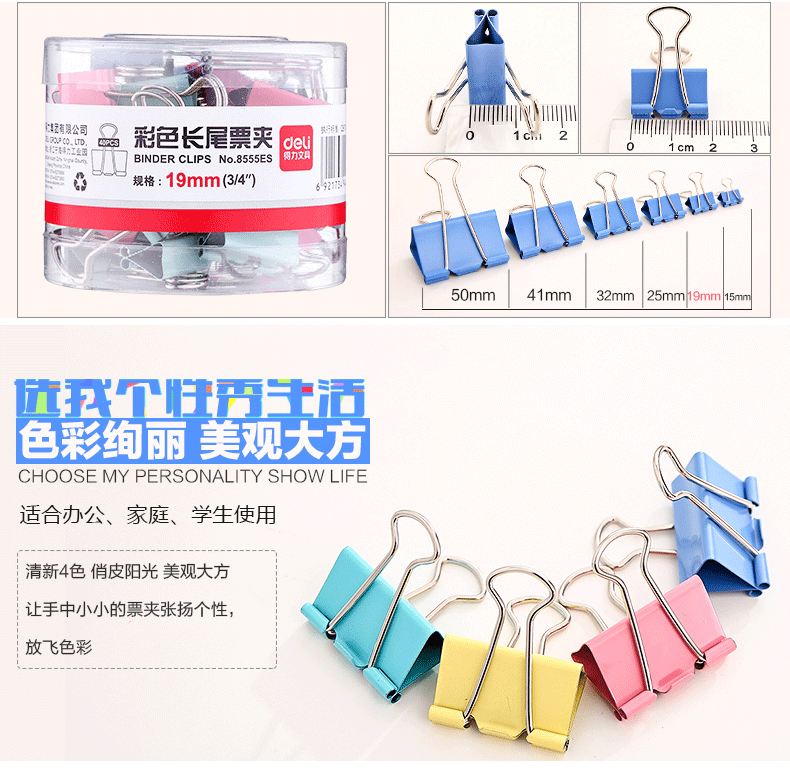 得力(deli) 8555ES(混)5#彩色长尾票夹(筒装