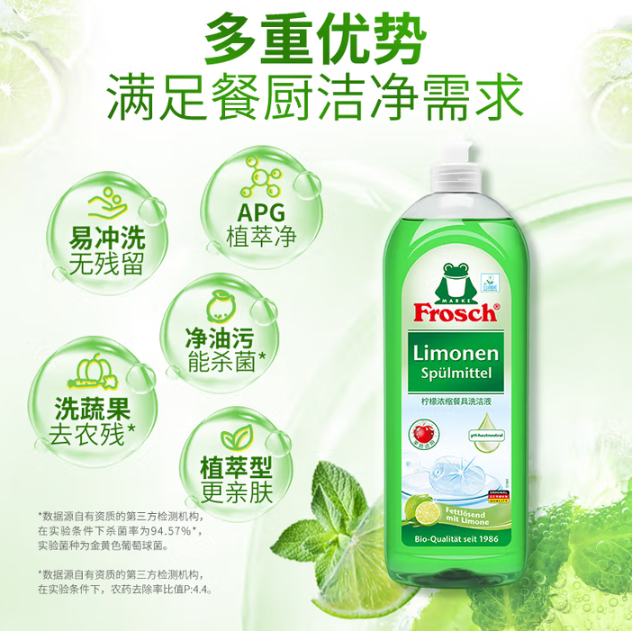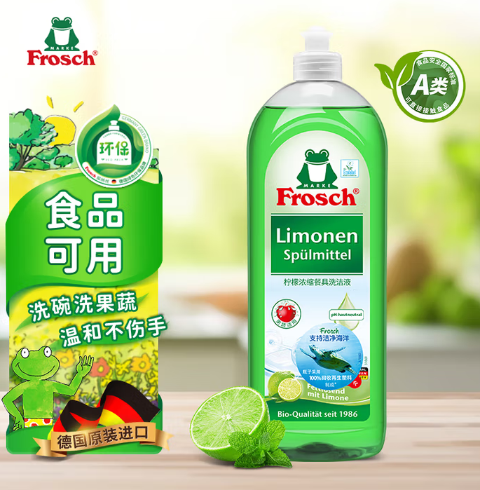 德国原装进口Frosch柠檬浓缩洗洁精750ml植物提取无残...